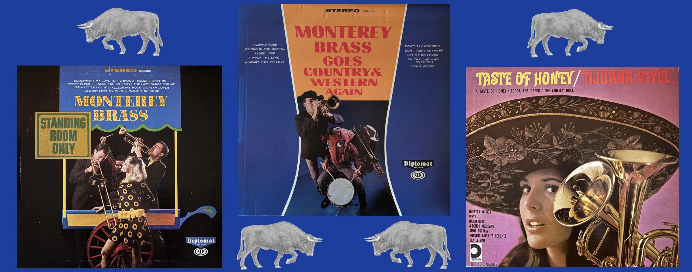 I recently picked up a couple albums at the same thrift store of a band that was new to me. Although Diplomat Records put out at least nine LPs by this outfit, I will not be looking to round out my Monterey Brass collection. They were obviously riding Herb’s coattails, but on the two records I have, there was no attempt to replicate the faux Tijuana sound. There is a Monterrey in Mexico, but Diplomat opted for the Northern California spelling. Some of the albums take their titles from Tijuana Brass albums like the one I have, “Standing Room Only,” as well as “The Lonely Bull,” “What Now My Love,” etc., but they also went with, “Blue Hawaii,” among others. The sound is pleasant enough adult contemporary, but you will never have to check the turntable to see if you accidentally put on a real TJB record. There is nothing to distinguish the music on, “Monterey Brass Goes Country & Western Again,” from the other one I own. There was an album released between the two I featured here, but the three musicians pictured on the covers are all wearing the exact same outfits… except for the paper mache horse head.