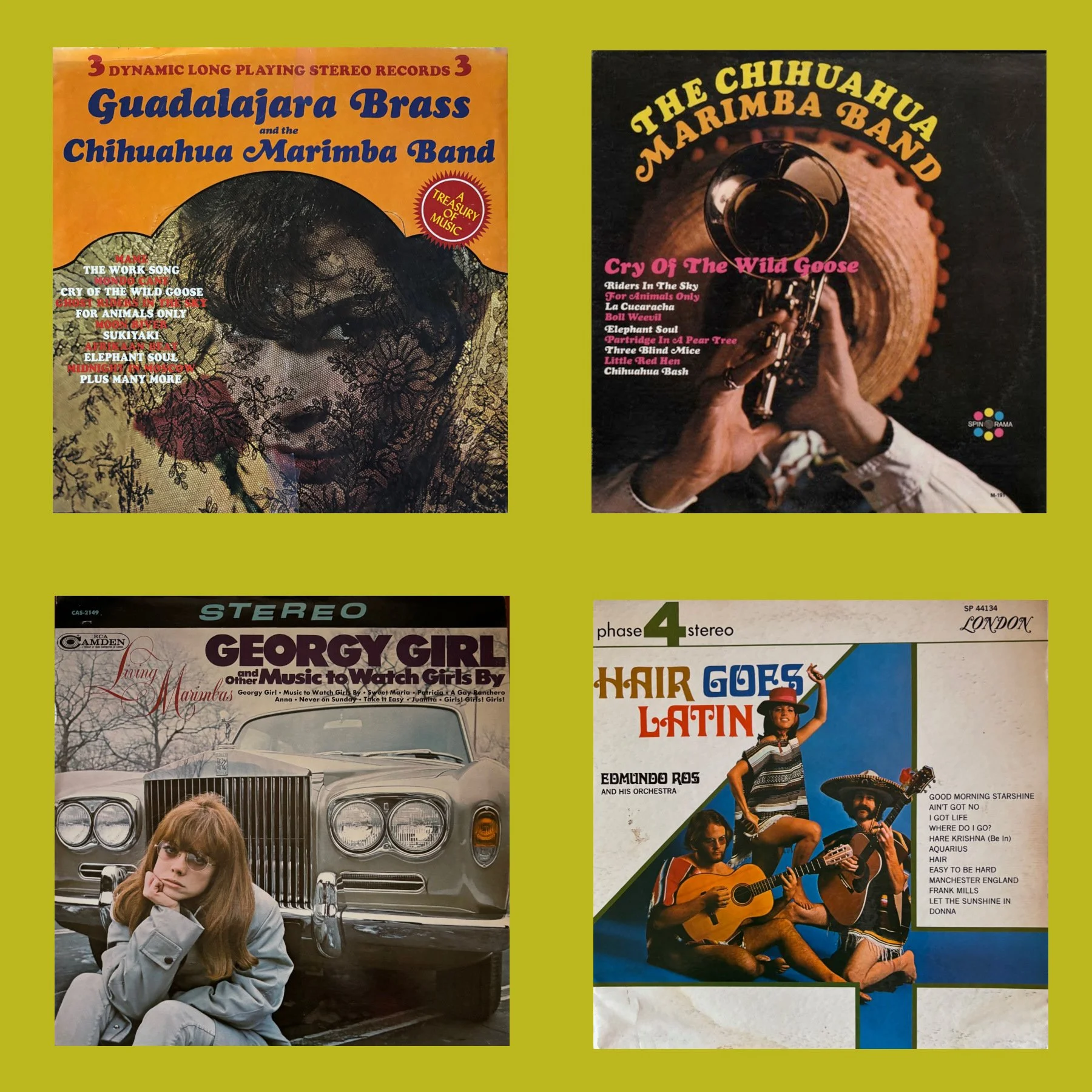 One of our favorite local thrift stores was shuttered last year. At least we scored some treasures while we could. Julia found a boxed set one day and showed it to me. I was a little reluctant at first because the cover was a bit beat up, but eventually I succumbed to her logic: three albums of bogus brass for one dollar is a total no brainer! I already had the two Guadalajara Brass albums, although I wasn’t aware of that at the time, but I certainly didn’t have the third one. I had to pull the image of the cover of the Chihuahua Marimba Band from the internet because the box just had paper sleeves for the albums and almost no other info on the cover, the back or inside. I had hoped the record might have someone doing high-pitched yappy dog melodies, but apparently the name comes from the region in Mexico rather than the tiny pooches. All the songs reference animals, they even close the album with “Chihuahua Bash,” but no barking…Rats! Maybe next time... This is some wonderful derivative manna that Baja Marimba Band fans will dig. Someone should have done an exploito Christmas album and listed the group as the Bah Humbug Marimba Band. Hell, I’d buy it!!